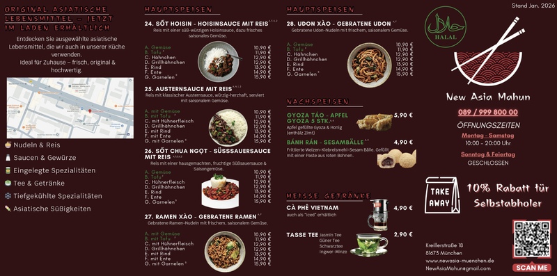 NEW ASIA MAHUN Kreillerstraße 18 81673 München 089 99980000 Öffnungszeiten Montag - Samstag 10.00 - 20.00 Uhr Sonn-und Feiertage geschlossen
